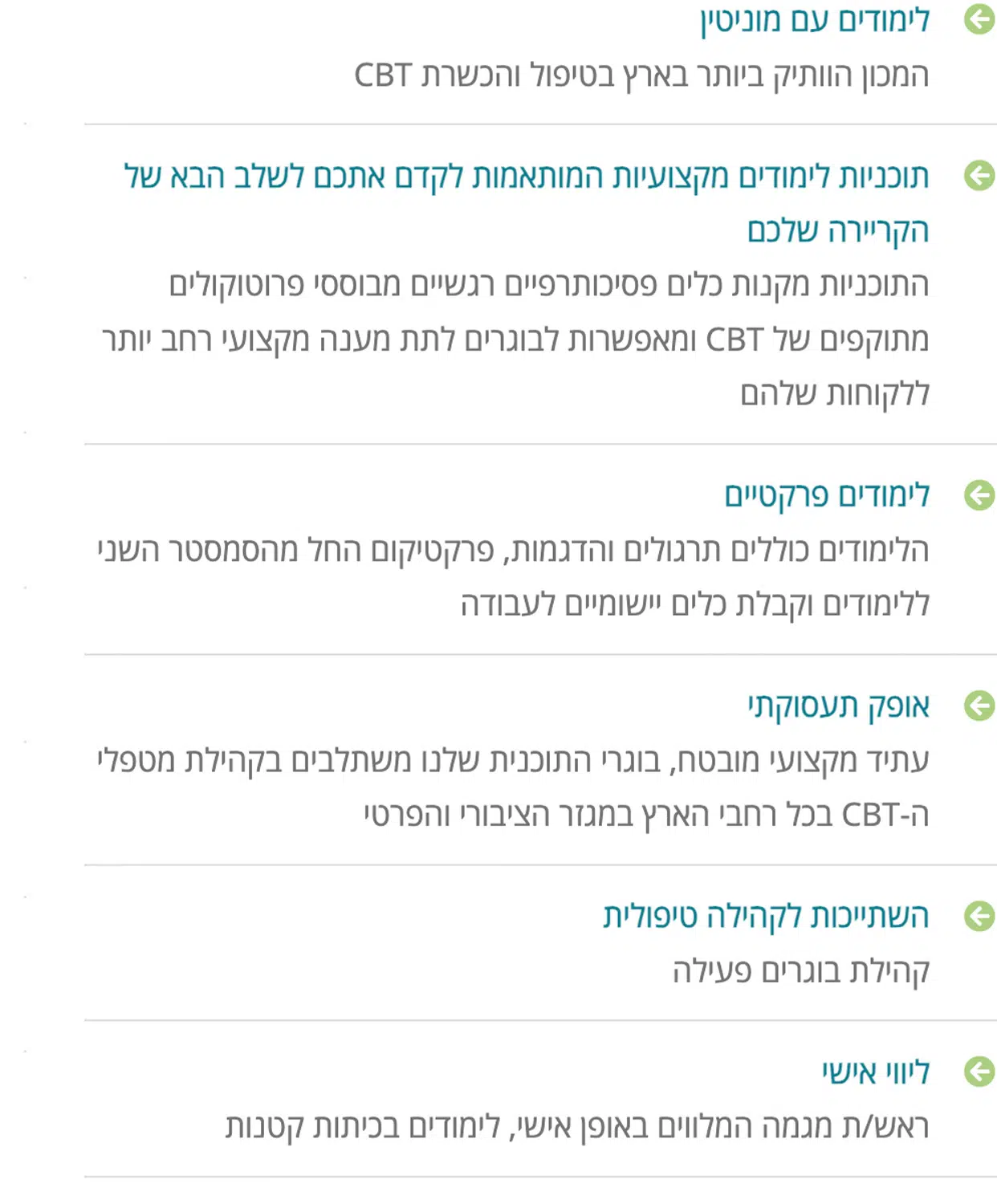 הלימודים מאפשרים העמקה ורכישת ידע תיאורטי ומעשי בתחום ה-CBT, בשילוב עם חוויה ויצירה.